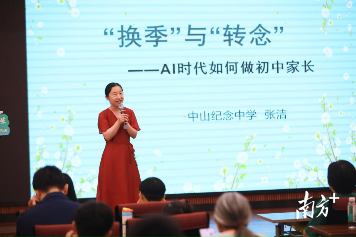 教育名家讲座环节,学校还特别邀请到中山市中山纪念中学语文高级教师张洁带来《“换季”与“转念”——AI时代如何做初中家长》主题讲座,与家长畅聊AI背景下如何做好小初衔接。